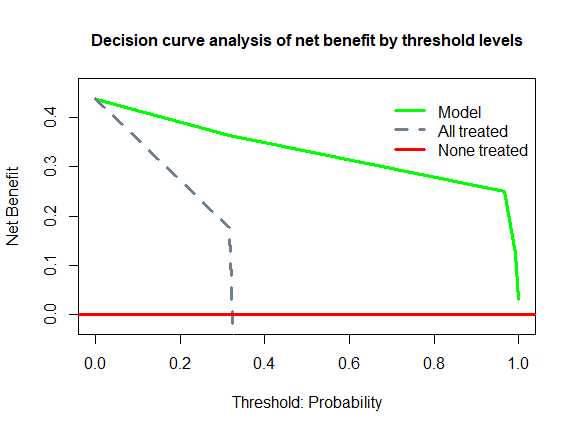 View decision curve analysis results like ‘net benefit’ at various thresholds of key interest at these percentiles: 0.01, 0.05, 0.10, 0.25, 0.50, 0.75, 0.90, 0.95, 0.99.