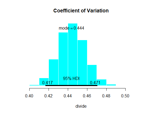 bcol="cyan", HDItext=.3, main= "Coefficient of Variation")
